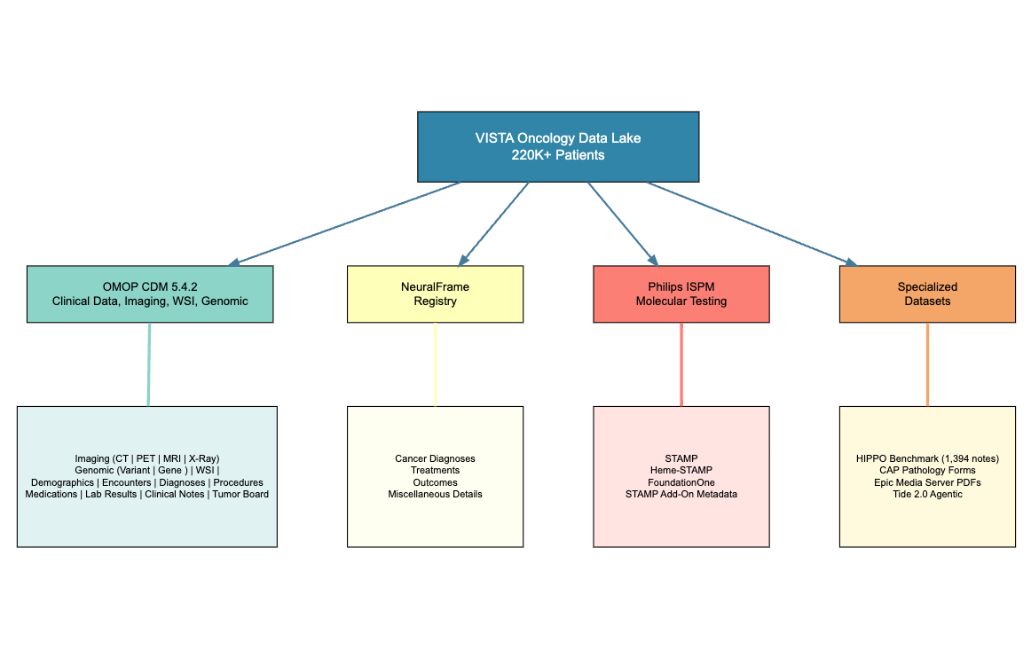 The VISTA Oncology Data Lake represents a multi-institutional effort to create a comprehensive, longitudinal cancer research resource. Through systematic data releases from February 2025 through February 2026, the platform has grown from approximately 200,000 to over 220,000 patients, progressively integrating clinical OMOP data, NeuralFrame registry records, medical imaging, and molecular testing from Philips ISPM. This evolution includes specialized datasets such as the HIPPO benchmark corpus and CAP pathology forms, alongside the development of disease-specific sub-cohorts for focused research applications. The November 2025 release introduces Agentic Tide in addition to updated OMOP 5.4. The February 2026 release further expands the platform with whole slide imaging and a custom variant occurrence table, marking significant advancements in multi-modal data integration and research capabilities.