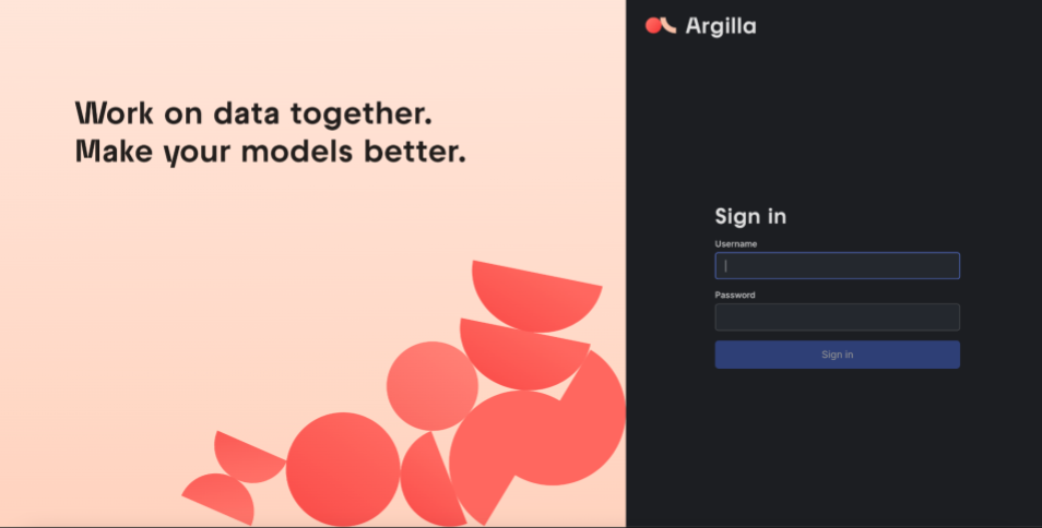 The software we will use for this annotation task is Argilla. Hugging Face recently acquired this startup, so we can expect continued support moving forward, given the extensive Hugging Face community. The software has been deployed in our internal cloud infrastructure. Once you connect, you should see the following screen. The software is only available internally.