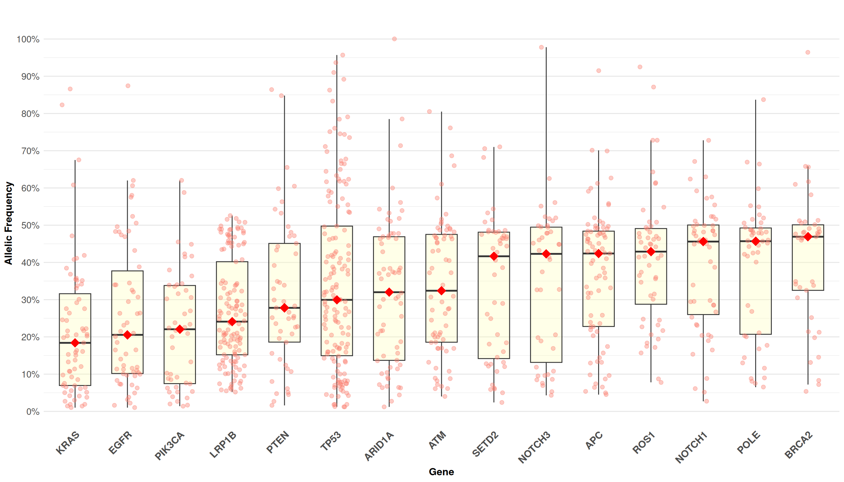 Interpretation: Each point represents a variant in a specific gene. Box plots show the distribution (median, quartiles, and range) of allelic frequencies for the top 15 most frequently mutated genes. Red diamond markers highlight the median allelic frequency per gene. Genes are ordered by median allelic frequency.